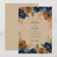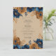 This design features a striking contrast between deep navy blue and shimmering gold-toned florals set against a warm tan background. The artistic rendering of lush roses and anemones creates an elegant, moody atmosphere. Delicate foliage sprays accent the blooms, adding a touch of rustic sophistication.