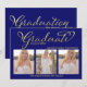Celebrate your graduate with this elegant navy blue graduation photo card featuring stylish gold script typography and a modern photo collage layout. Personalize with three senior portraits, graduate name, class year, and school information. The back of the card includes space for graduation party or open house details, making it perfect for sharing this special milestone with family and friends. A timeless design ideal for high school or college graduation celebrations and perfect for school colors like navy and gold.