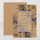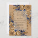 This design features a sophisticated blend of navy blue and golden tan tones, creating a refined rustic aesthetic. Elegant watercolor roses and lush peonies intertwine with delicate foliage to create an ornate botanical arrangement. The warm, earthy backdrop enhances the vintage atmosphere, making it ideal for a timeless nuptial event.