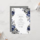 This design features a sophisticated palette of deep navy blue and charcoal gray floral arrangements. Large, velvety roses are accented by delicate blossoms and silvery-toned leaves, creating a stately and elegant mood. Set against a crisp white background, the painterly blooms evoke a timeless, formal atmosphere perfect for a winter or evening affair.
