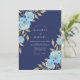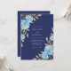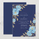 This botanical design showcases a deep midnight backdrop adorned with ethereal light blue roses. Shimmering gold foliage provides a luxurious contrast against the dark background. The watercolor floral elements create a sophisticated aesthetic perfect for a formal winter or evening event.