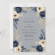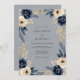 This design features deep navy roses and creamy white peonies set against a muted slate gray background. Shimmering gold foliage accents the rich floral arrangement, creating a sophisticated and regal aesthetic. The color palette is perfect for a formal winter ceremony.