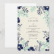 This design features a sophisticated botanical border with deep navy blue cosmos flowers and delicate seafoam green foliage. The ivory backdrop creates a clean, polished look suitable for a formal spring or winter event. Rich watercolor textures bring the leaf sprigs and petals to life, offering a timeless nature-inspired aesthetic.