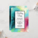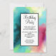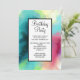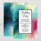 Convite de festa de aniversário com um design abstrato moderno e elegante. As aquarelas se misturam para criar a ilusão de uma imagem espacial. Verde com toques de roxo, amarelo e vermelho claro se misturam com uma pitada de pontos brancos e estrelas. Uma criação artística elegante.