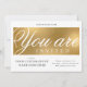 Crie convites profissionais para negócios para seu evento com este moderno convite de festas de empresas branco e ouro. Você pode editar todo o texto, adicionar o logotipo e os detalhes do evento para criar convites para o na moda para sua festa de lançamento, noite de gala, janto de arrecadação de fundos ou qualquer outro evento corporativo. A fonte do script de tendência escreve 'você é convidado' e o fundo do efeito ouro falso adiciona uma sensação de luxo extra a esses convites da empresa.