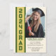 O convite para Formandos negros e modernos funciona para a Escola do Meio, Segundo grau ou Faculdade. Posicione seu Formando sorridente com uma faixa nas cores da escola verde e dourada. As informações da parte de Formando podem ser adicionadas na parte inferior! Parte da graduação! Coleção, procure um conjunto completo de produtos de Formando.