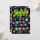 A luz preta colorida de várias cores e o sinal de néon amarelo e verde brilham no convite de aniversário escuro.