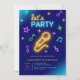 Elegante convite de aniversário com microfone amarelo neon e notas coloridas de música no chão preto azul escuro.