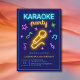 Elegante convite de aniversário com microfone amarelo neon e notas coloridas de música no chão preto azul escuro.
