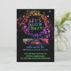 As cores néon brilhantes e estreladas brilham convites de festas- Lê-se 'Vamos brilhando maluco' no topo em tons de luzes marqueadas neonatais que parecem estar em tons de néon brilhante rosa, azul e verde. Enquadrado em círculos de estrelas brilhantes, púrpura, azul, vermelha, laranja e dourada. Nome personalizado de honra e evento abaixo, em cor-de-rosa correspondente em um quadro de estrelas preto e rosa claro, metálica falsa e brilhante. Informações personalizadas sobre o partido, incluindo detalhes de RSVP, estão em azul neon e verde neon. Contra fundo preto com efeito de padrão estrelado de brilho multicolorido, roxo, rosa, dourado e brilho multicolor. A parte de trás tem fundo preto correspondente e padrão de brilho intenso. Use o botão Personalizar para personalizar qualquer uma das cores, estilos ou posicionamento do texto. Nota: Todas as imagens são impressas. Nem neon nem brilho. Convites de festa de aniversário divertida, quer você esteja fazendo 5 ou 16 anos. Pronto para ser personalizado com seu próprio brilho nos detalhes da festa escura.