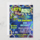 Convite de festas de patinação de rolo para ele, para um menino ou um homem de cor azul e néon verde-clara com detalhes personalizáveis de festas, tema neon retro.