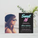 Legal décimo sexto convite de aniversário. "Doce 16" é escrito em roteiros cor-de-rosa-quente e lacrimejantes com um efeito de luz neon contra um fundo preto. e você pode personalizar com sua foto.