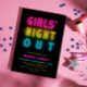 Diversão do convite para festas de solteira com a Noite de Meninas, escrita com luzes de néon em magenta, amarelo e turquesa contra fundo preto.