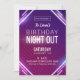 Um convite de festa de aniversário para uma noite na cidade. O néon brilhante acende design em roxo e azul.