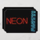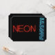 Um convite para o shimmer de pérolas com estilo de tíquete de 5" x 7" com uma imagem de "neon" (neon) vermelho e laranja, e "party" (festa) de feitiço de néon azul a preto. O verso é preto com texto personalizável azul neon. Neon era grande nos anos 80 e este convite é um lembrete divertido. Veja o envelope correspondente, caixa de favor, bolsa de presente médio e etiqueta. Veja a coleção inteira de convites da Tubular 80s nos CONVITES | Seção Convites e Cartões.