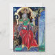 Pintura colorida, vibrante e contemporânea em cores dourada, azul, vermelha, verde, castanha. Um misterioso feiticeiro hipnótico com fantasias elegantes de veludo vermelho segurando uma esfera mágica sentada num trono gótico com gargantas e coruja. Ambiente é surreal, fantástico, alquímico onde você vê um testículo é bebendo de uma xícara, um monge templar voando sobre um sapo, bolhas transparentes, paisagens de fantasia com fogo infernal, céu azul cósmico com estrelas, montanhas do céu, árvores .Egg Tempera em um painel de madeira com folha de ouro. 1989, Miniatura Feita com técnicas pictoriais de 1300 por Alessandro Lumini (c) É também uma bela design de fantasia para Natal, Férias, Aniversário, Dia da Véspera de Ano Novo, Mardi Gras e Saudações de Carnaval.