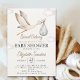 Celebrate your baby's arrival with our charming, gender-neutral baby shower design, featuring a classic white stork flying over a soft, light brown sky, carrying a sweet baby. Perfect for a boy, girl, or surprise shower, this elegant and minimalist design adds a warm and timeless touch to your event. For complementary elements, see our collection of this lovely design.