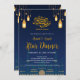 Invite your guests to a beautiful evening of reflection and community with this stunning Iftar invitation. The design features a majestic navy blue mosque silhouette set against a deep night sky, adorned with glowing golden lanterns, stars, and crescent moons. This atmospheric and elegant card is perfect for Ramadan dinner parties, community Iftar events, or Eid Al-Fitr celebrations.
