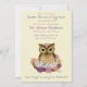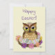 Coruja-Páscoa-marrom-branca, sentada num ninho de ovos de Páscoa de cor pastel e flores contra azul-claro