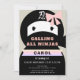 Este simples e fofo convite de aniversário da Ninja apresenta uma ninja em roupa preta com uma fita rosa sobre o fundo da cinza. O verso apresenta um fundo cor-de-rosa com padrões de estrelas pretas. Altere a cor de fundo e personalize para suas necessidades. Você pode encontrar mais produtos correspondentes na minha loja.