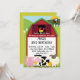 Este convite de festas de aniversário bonito apresenta uma cena de barraca com animais de fazenda, um celeiro vermelho, um galo e um trator de fazenda.