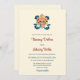 Este convite de casamento tibetano moderno apresenta um nó sem fim ouro com fitas azuis em fundo creme.
