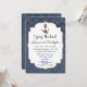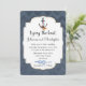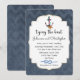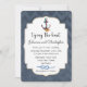 Um convite de casamento com tema náutico. Definido em um fundo de chevron azul escuro, com uma moldura ornamentada com uma borda gradiente dourada. Uma âncora de aquarela com uma corda enrolada em torno dela, em rosa e verde aqua. Com uma concha ao lado de sua base. Com um nó náutico na parte inferior. Personalize com todos os detalhes do seu casamento.