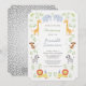 Adoráveis animais da selva, com videiras doces e folhas cercam este adorável convite de Natal. Elefantes azuis fazem uma cruz no topo do convite com girafas, macacos, zebras e leões cercando-o. Seu texto está no meio de tudo para anunciar o grande dia do seu pequeno.