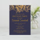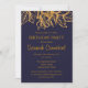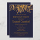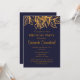 Um convite de aniversário azul-chic e de ouro com um padrão floral decorativo de ouro no topo, e um buquê floral de ouro de solteiro no verso do anúncio, tudo sobre um fundo azul-escuro/azul-meia-noite.