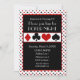 Este convite de festas de pôquer apresenta um fundo de um padrão repetitivo de diamantes vermelhos, espadas negras, corações vermelhos e clubes negros. O centro do convite tem modelo para personalizar com um nome e suas informações de evento.
