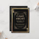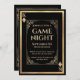 Este convite de festas da Noite de Jogo apresenta um clássico design de cartas de jogar em um fundo preto. Um quadro de estilo de vintage e ornamentado envolve a área de texto central. Um quadro de design de folha de ouro correspondente borda o convite. Dois diamantes de ouro e o monograma rei são impressos em cantos opostos, semelhantes ao layout de um baralho.