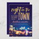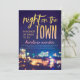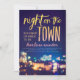 Convite da festa de solteira da tipografia com noite na cidade escrita sobre uma foto borrada de uma cidade na noite.