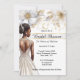 Uma linda mulher afro-americana/melanina com as costas para você está olhando para trás em seu ombro e é moldada por um fundo branco que tem bonito flores florais brancas no topo. Ela está vestindo um lindo vestido branco que tem detalhes sobre ele e um detalhe de coração aberto em forma de fundo. Seu cabelo é varrido em um pão de na moda, enfeitado com uma banda branca de rendas, e ela veste brincos de diamante para terminar seu elegante olhar. Modelos pretos parecem-lhe à direita para a sua redação personalizada e um solteiro branco horizontal e um ouro falso tem o nome da ocasião que aparece em negrito num script de caligrafia. Este design é ideal para chás de panela de ouro simples e elegantes, florais ou botânicos e falsos. Sinta-se livre para mudar a cor do fundo e da fonte para qualquer cor de sua escolha para se adequar à sua ocasião especial.