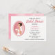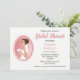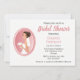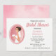 Um convite de chá de noiva com uma ilustração de uma noiva sorrindo segurando um buquê de flores em seu vestido de noiva elegante e usando um véu. Definido dentro de uma moldura oval rosa com uma borda rendada.