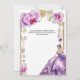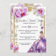 Uma bela borda de espiral decorativa de ouro falso tem flores florais roxas delicadas e roxas e forma uma moldura em volta de um fundo branco estrelado. Uma moça aquosa aparece no canto inferior direito vestindo um belo e luxuoso vestido com pequenas flores de rosa. O vestido da bola tem um corpete apertado ao ombro e uma saia de rúfle ideal para uma noiva ser. À esquerda dela estão o luxo roteiro de caligrafia negra e modelos de texto em negrito para sua redação personalizada. Este convite é ideal para um casamento de verão, primavera ou outono (outono) que está sendo realizado em um jardim ou em um local ao ar livre. Celebre a noiva para estar com este design de luxo, moda e atordoante ideal para um chá de panela, Quinceañera ou negócio lançando seus novos vestidos noturnos e casamentos para clientes.