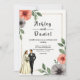Este elegante convite de casamento floral de aquarela é perfeito para um casamento moderno. A design romântica apresenta uma elegante estrutura floral de aquarela com uma ilustração noiva e noiva e caligrafia preta sobre fundo branco.