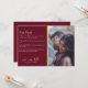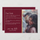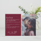 Este estilo moderno e minimalista que salva a nossa data para o convite de casamento apresenta um fundo burguês com uma colocação horizontal. Uma lista de fatos divertidos sobre a noiva e o noivo ou casal são impressos à esquerda, com uma amostra de fotografia do casal à direita. Uma linha de ouro separa as partes superior e inferior. Você pode personalizar o anúncio para incluir sua própria foto ou imagem personalizada. É uma maneira simples e única de entreter seus convidados e deixá-los ver um lado pessoal de você.