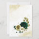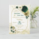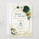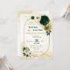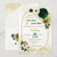 Convite de casamento botânico lindo com flores em verde esmeralda, branco marfim e dourado com folhas douradas em uma cápsula dourada. Os detalhes em brilho dourado são simulados. É adequado para convites de casamento e noivado. PARA MAIS PRODUTOS RELACIONADOS clique na coleção acima ou entre em contato.