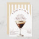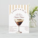 Noiva retrô em um Chá de panela de Tini Bit Espresso Martini - Celebra a noiva de estar com um chá de panela temático de cocktail em estilo retrô clássico com este convite para chá de panela espresso martini. Apresentando uma ilustração aquarela do coquetel de café com grãos de café como uma granja sobre um arco e fundo listrado. Com mocha bronzeada, leve, creme e paleta de cor castanha. Com uma mistura de texto e letra de script inspirados na retrovintage. Edite este modelo de chá de panela para impressão de acordo com as suas necessidades. Faça o pedido no impressão ou como um download digital instantâneo, envie-o através de texto, email ou mídia social. Perfeito para um café de café expresso martini, chás de panela de primavera ou de Verão para ambientes interiores e exteriores.