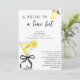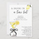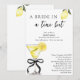 Convite de Chá de Noiva com Bride In A Tini Bit Lemon Drop Martini - Celebre a noiva com estilo com este convite de chá de noiva com martini de limão com laço preto coquete, com fundo branco crocante e fonte preta. Apresenta uma ilustração em aquarela de um martini de limão amarrado com um laço preto com acentos de limão. A mistura de texto cursivo estiloso e texto em bloco elegante torna este um convite de chá de noiva chic e elegante. Personalize este convite de brunch de noiva editável com os detalhes do seu evento. Perfeito para um chá de noiva com tema de limão, um brunch de noiva com tema de martini ou um tema de soirée de noiva com laço preto. Disponível como download digital instantâneo, envie-o por mensagem de texto, e-mail ou mídia social.