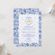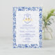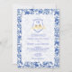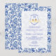 Comunique uma elegância atemporal com este convite de casamento inspirado na toile francesa. Com uma borda floral azul detalhada, tipografia clássica serifada e um monograma de crista romântica com pombos dourados e as iniciais do casal, este design traz um charme luxuoso do velho mundo para a sua celebração. Perfeito para casamentos em propriedades elegantes, temas de campo francês ou casais que buscam uma estética europeia vintage. Personalize com os detalhes do seu casamento para criar um item de recordação cheio de romance e tradição.