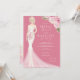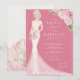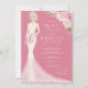 Convites de chá de panela adoráveis apresentam uma noiva ilustrada para estar em um vestido de noiva de sereia de rendas e cercado por rosas e peônias brancas desenhadas à mão. Escolha o penteado, a cor do cabelo e o tom da pele que mais se pareça com a noiva. A parte de trás do convite tem um lugar falso e rosa rosa.