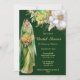 Um belo gráfico de aquarela de uma noiva indiana vestindo um vestido de noiva verde e dourado com aparas decorativas de ouro e um longo véu está caminhando em direção a você segurando um buquê bonito de cor laranja e ouro amarelo. Ela está por baixo de um solteiro grande branco e de uma flor verde solteiro em floração de cheio contra um fundo verde escuro. O roteiro de caligrafia colorido de ouro e os modelos de estilo romano parecem-lhe à direita para a sua redação personalizada. Este design é ideal para chás de panela elegantes, simples, verdes e dourados florais ou botânicos. Sinta-se livre para mudar a cor do fundo e da fonte para qualquer cor de sua escolha para se adequar à sua ocasião especial.