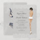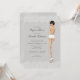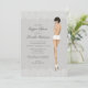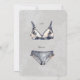 Lingerie chá de panela apresenta noiva para estar em sua cueca com um fundo antigo. Várias opções disponíveis para o cabelo e o tom de pele da noiva. O verso do convite apresenta sutiã e calcinhas com tamanhos.
