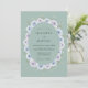 Este design apresenta um fundo suave verde sage adornado com um arranjo botânico de flores em aquarela em tons de azul pervinca e lavanda. Peônias pintadas e ranúnculos delicados são acentuados por minúsculas flores brancas e folhagens tênues. A paleta evoca uma atmosfera serena de primavera, perfeita para uma cerimônia romântica ao ar livre ou um evento sofisticado à tarde.
