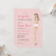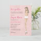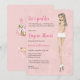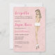 Dê à noiva um chá de lingerie sexy com estes convites cheios de noiva em nada além dos calcanhares e calcinhas! Fundo de lingeries cor-de-rosa e dourado, com sutiã e cobertura de cor-de-rosa com os tamanhos de noiva atrás. Várias opções disponíveis para personalizar o estilo de cabelo, a cor do cabelo e o tom de pele.