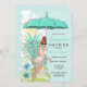 Convite de chuveiro de lingerie nupcial apresenta flores tropicais azuis e verdes, guarda-chuva e noiva ruiva. Disponível com cabelo loiro, castanho e ruivo e pele clara e escura.