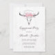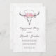 Convide seus convidados de festa de noivado em estilo com este convite temático. Este modelo de design apresenta um crânio de vaca boho desenhado à mão com um vestido cor-de-rosa pincelado de cabeça floral de rosas delicadas sobre um fundo de madeira branca e cinza, curvada. Personalize seus detalhes de casamento em um roteiro preto elegante. A parte traseira da placa também tem uma textura falsa de madeira para combinar. Os melhores votos para o seu noivado e casamento! Desenhada pela artista Susan Coffey.
