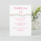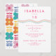 Um convite de aniversário lúdico que mostra flores desenhadas à mão e uma espiral colorida do arco-íris.