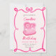 Celebre no estilo vintage com nosso encantador convite de aniversário de bolo rosa! Este design delicioso apresenta um pano de fundo cor-de-rosa macio adornado com sotaques rosa vibrantes, capturando perfeitamente a essência da elegância retrorreflectora.